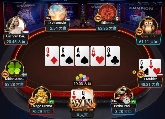 FT初始,Astedt以83.5BB领跑,记分牌最少的是黄文杰仅9BB。不过开局第二手牌,黄文杰便凭借一次KQo翻前全下跑马成功翻倍。