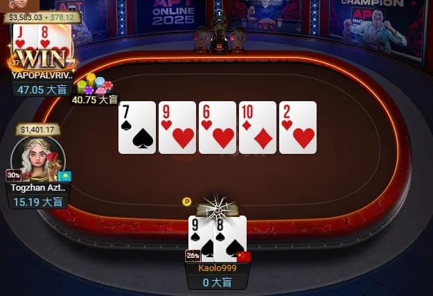 随后50分钟内,多次全下对决迅速将战局压缩至三人阶段。尽管Kaolo999在关键牌局中击中顺子,但YAPOPALVRIVER的牌力更胜一筹,国人无奈止步季军。