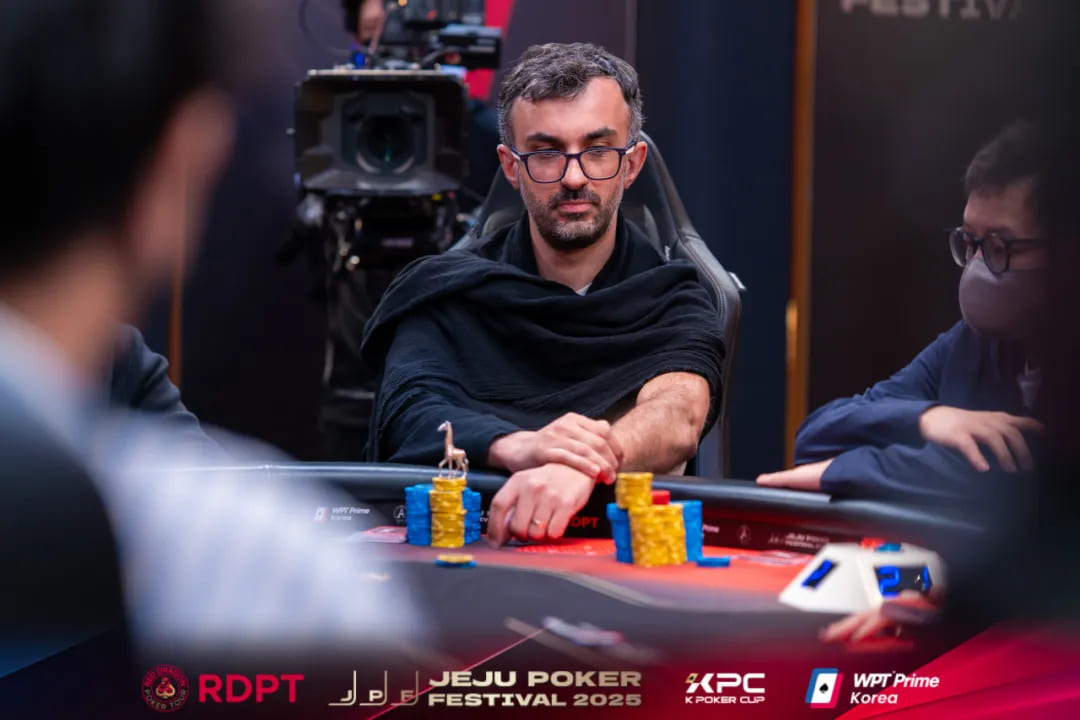 转牌的一张5♣️让他坐了下来,不过轮到对面的Duta Florian Dimitrie站了起来,最后河牌的J♥️将Duta Florian Dimitrie送出赛场,成为决赛桌首位出局选手,带走第9名。