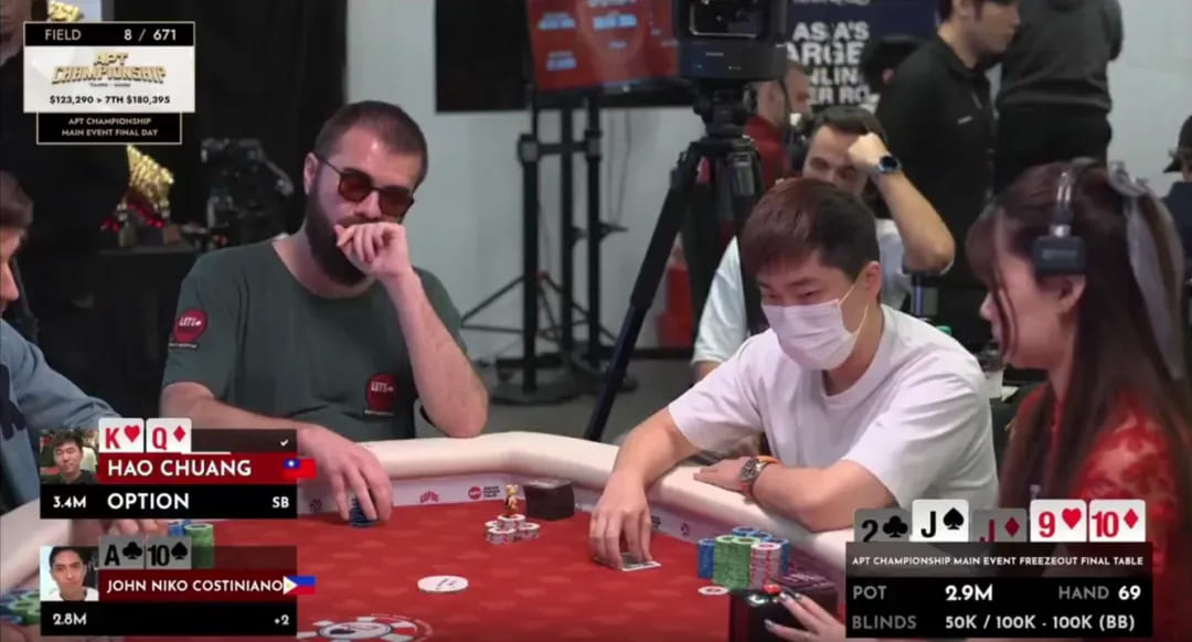 Chuang下注1,800,000。但接下来Costiniano的操作出乎所有人的意料:他直接All in了!