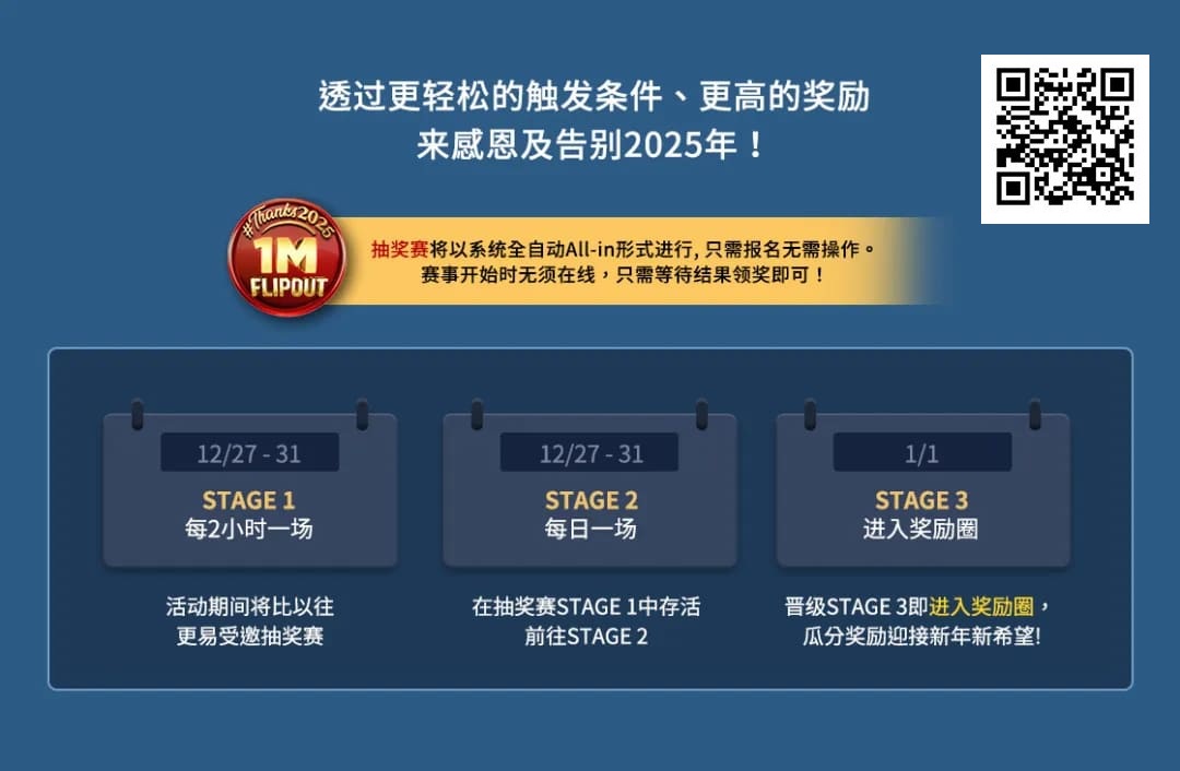 12/28-1/1阶段2,晋级玩家继续在抽奖赛中竞争,每日一场。来到1/1阶段3即进入前圈,轻松瓜分1M刀总奖励!