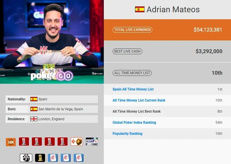 “Adrian Mateos以不到30岁的年龄,成为历史上第一位在无限德州扑克赛事中获得五条WSOP金手链的选手。”