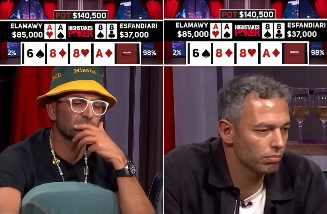 盲注级别500/1,000,由Scratch公司老板Sameh Elamawy率先行动,手持A♠A♥加注到5,000。后位的Esfandiari用8♠8♣跟,Justin Gavri在大盲位也拿J♣7♣进来看牌,底池18,500。