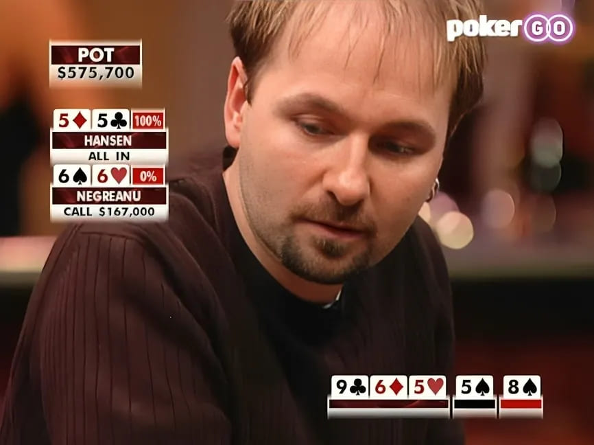 当年双方同样在翻牌圈中三条,结果Hansen于转牌靠着唯一能反超的5组成四条,最终拿下575,500刀巨大底池。