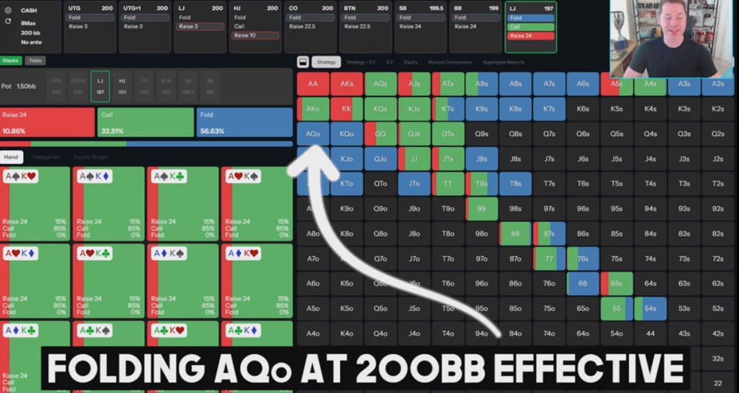 在我看来,AQ不同花可以轻松跟注。但是!如果要谈完美的打法,也就是打GTO扑克,AQ不同花正确的打法其实是反加或弃牌。