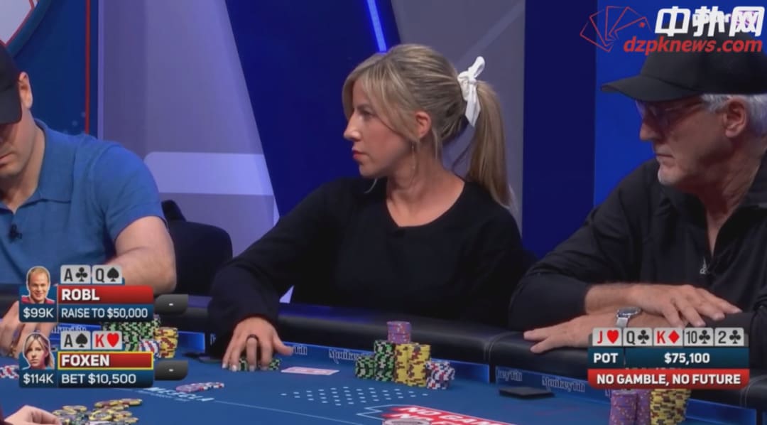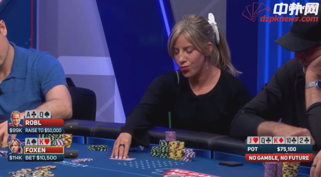Robl在HJ位用AQ不同花开池到1100,Kristen Foxen加注到3800,她的牌是AK不同花。