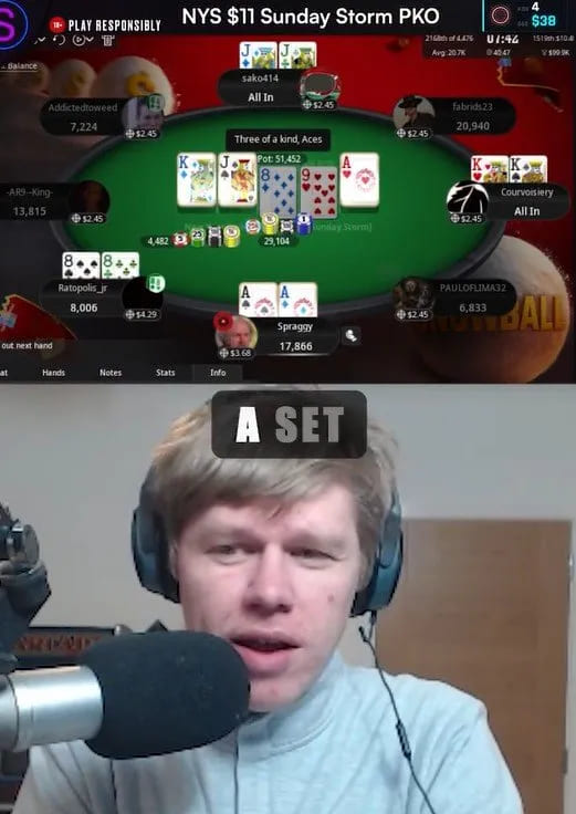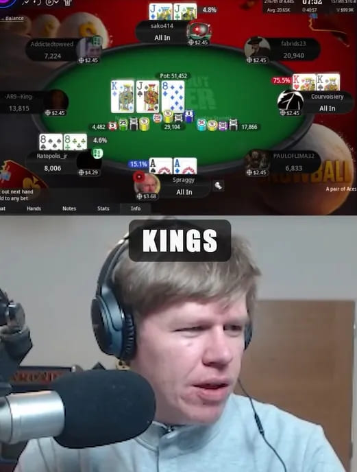 事件发生于PS新年系列赛的11Sunday Storm PKO赛事中,Spragg手拿AA翻前全下,和另外三家口袋8、口袋J以及口袋K跑马。