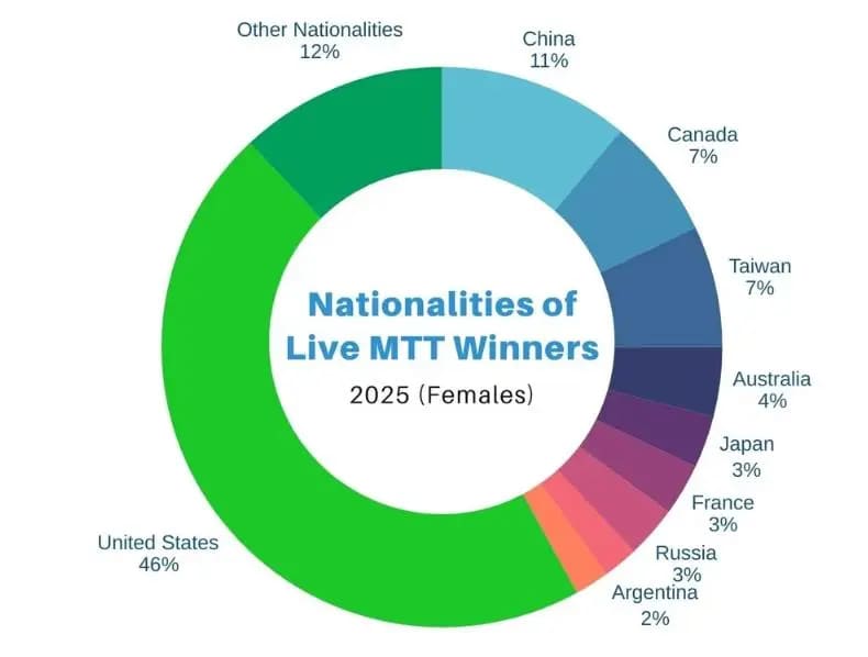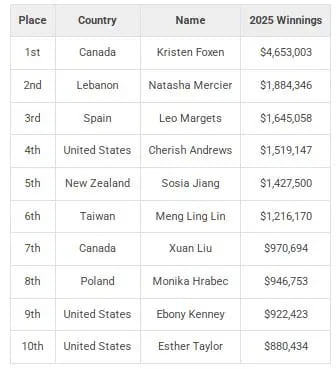榜单上不乏熟悉的面孔,如Ebony Kenney、Xuan Liu和Victoria Livschitz。其中,Kristen Foxen是唯一一位连续两年进入前十的玩家,她在2024年位列第二(收入1,747,805美元),2025年更是一举夺魁(收入4,653,003美元)。2025年,她展现了绝对统治力,其收入几乎占据了百强总奖金的13%。