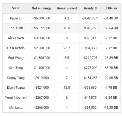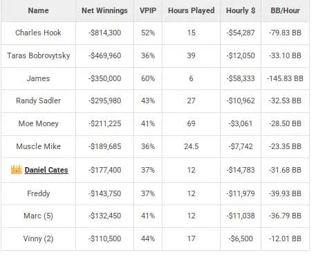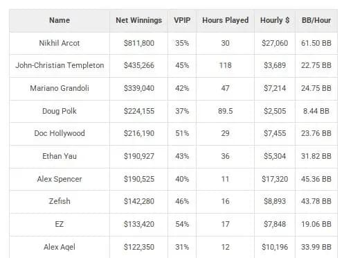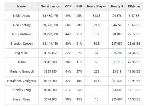 最高每小时赢率:Nik Airball以每小时27,060美元的赢率领先,他全年在The Lodge游戏了30小时。