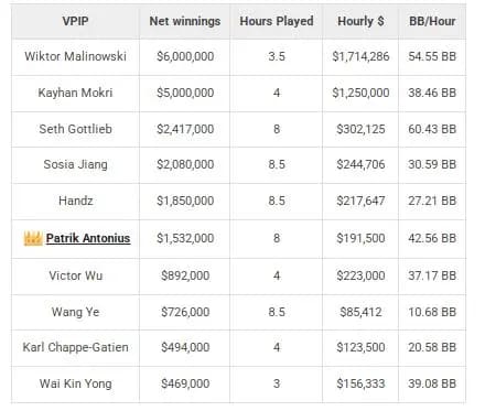 2025年Triton常规桌中,每小时赢率最高、总盈利最多的玩家是Wiktor Malinowski(Limitless)。他仅游戏3.5小时便斩获600万美元,创造了约每小时170万美元的惊人赢率。