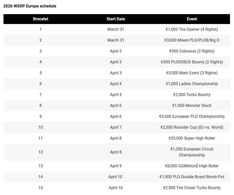 2026 WSOPE将于3月31日至4月12日举行,全新1,000欧报名的女士赛将在4月4日(周六)于布拉格希尔顿酒店开打。