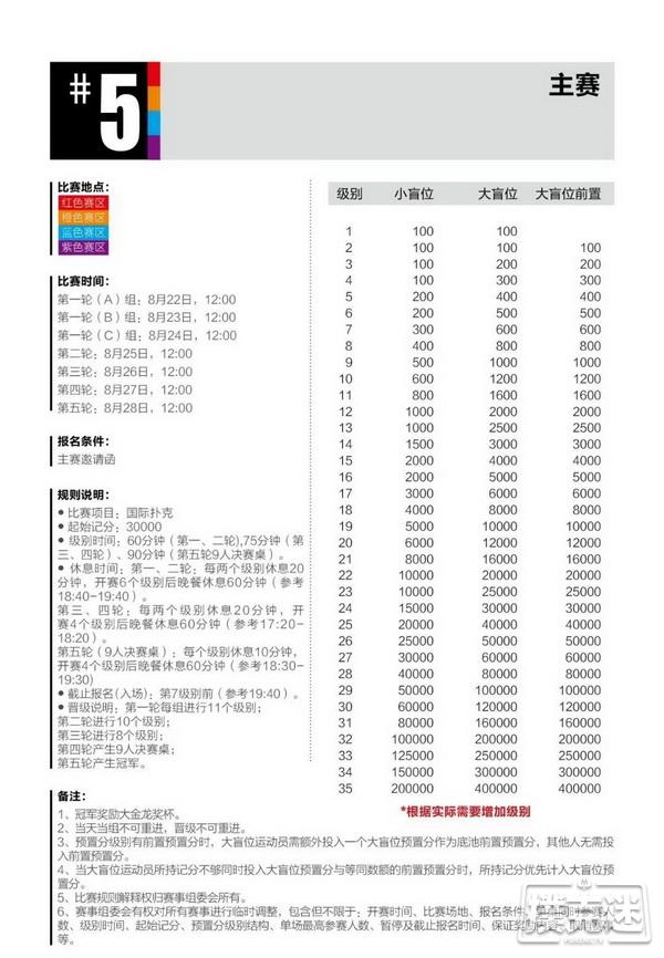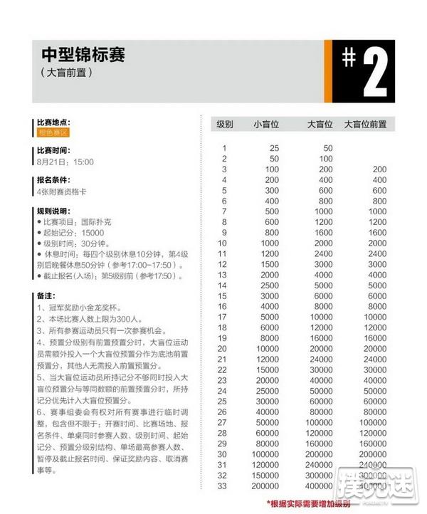 本届赛事附赛囊括了团队赛,锦标赛,挑战赛,邀请赛,资格赛共五大类比赛,其中部分国际扑克类比赛将采用大盲前置预置分模式。