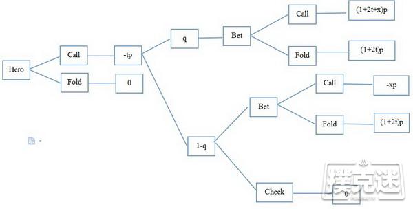 最后,我们可以得到hero整个跟注策略的总EV:q(1-a)(1+2t+x)p+qa(1+2t)p-tp,其中,a=x/(1+2t+x)。而他直接弃牌的EV是0,那么,求解方程q(1-a)(1+2t+x)p+qa(1+2t)p-tp=0即可得到我们所想得到的x值。