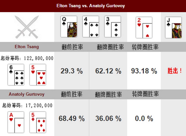 此时比赛已经进行到单挑阶段。对局中拿着6♣ 5♥的选手是中国香港选手Elton Tsang,曾14次打入扑克赛事钱圈,生涯扑克赢利近1260万美元。Tsang的对手是俄罗斯选手Anatoly Gurtovoy,曾13次打入扑克赛事钱圈,生涯扑克赢利约653万美元。