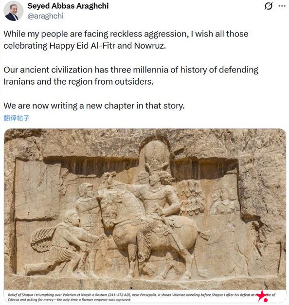 伊朗外交部长阿拉格齐在社交平台发布了一张历史雕像照片。该雕像显示,古罗马帝国皇帝向古波斯帝国皇帝下跪。