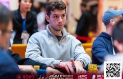 此时依旧是7位选手在场上,此前于国迪刚拿下一个翻倍,计分牌又多了不少,来到这手牌,第28级别,盲注50k/100k/100k,翻前于国迪在MP位置open30万,周立明在CO位置看完手牌直接all-in49.5万,其他选手弃牌围观,行动回到于国迪这里,搓了搓手爽快接下对手挑战,