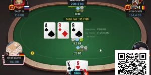 在单挑后两人的记分牌都保持在40bb之上,打的有来有回。在Joey略微反超金波,两人记分牌3:2时,金波做出了一个大胆的决定,他在BTN位选择全下40bb,Joey 坐拥60bb在大盲位陷入长考。