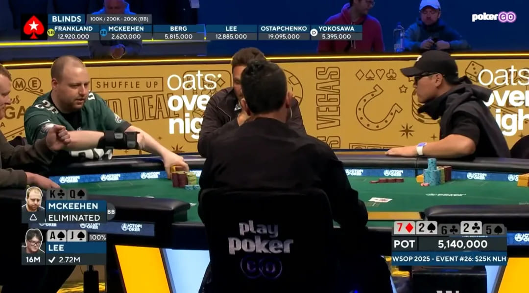 但在单张成顺的牌面AK选择河牌全下,flop金顺双摇,河牌击中K4两对的Lee轻松跟注,一切都尘埃落定,Chang Lee爆冷摘得桂冠。
