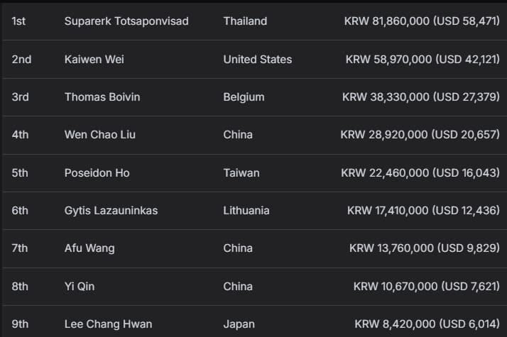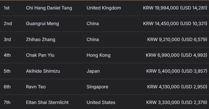 中国选手Guangrui Meng获得亚军,收获14,450,000韩币(约合10,321美元)奖励;其同胞Zhihao Zhang位列季军,获得9,210,000韩币(约合6,579美元)。