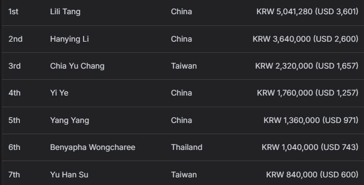 亚军由同胞Yixuan Dong获得,收获3,520,000韩币(约合2,514美元)奖励;同样来自中国的Bei Shi位列季军,获得2,270,000韩币(约合1,621美元)。