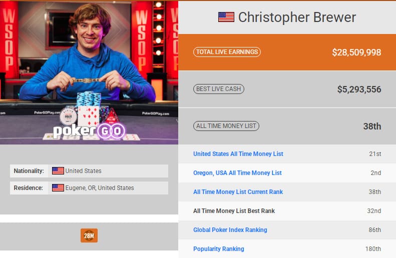 在2024年5万刀买入WSOP职业玩家冠军赛(被誉为“最难打的赛事”)中,Brewer一度筹码领先,最终止步第三名,收获 51.9万美元奖金。