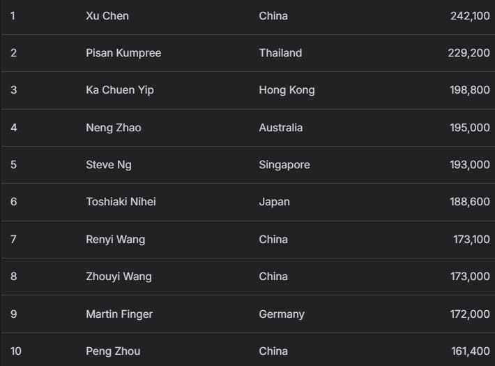 中国香港选手Ka Chuen Yip以198,800记分牌量位列该组第三。德国选手Martin Finger与中国选手Peng Zhou同样跻身记分牌量前十。