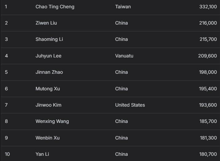中国选手Xu Chen登顶主赛涡轮C组记分牌榜