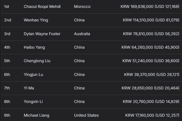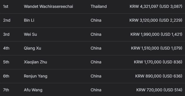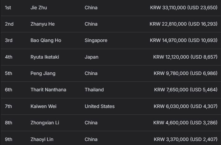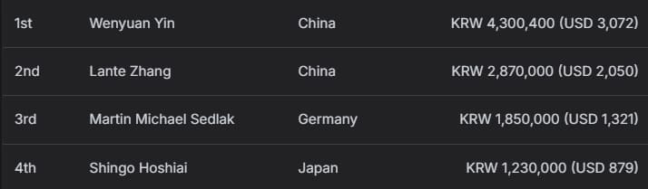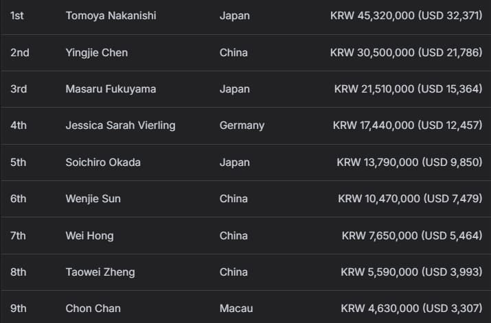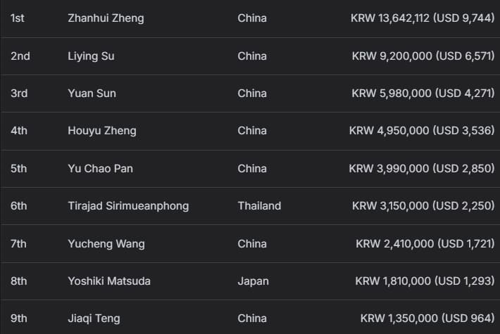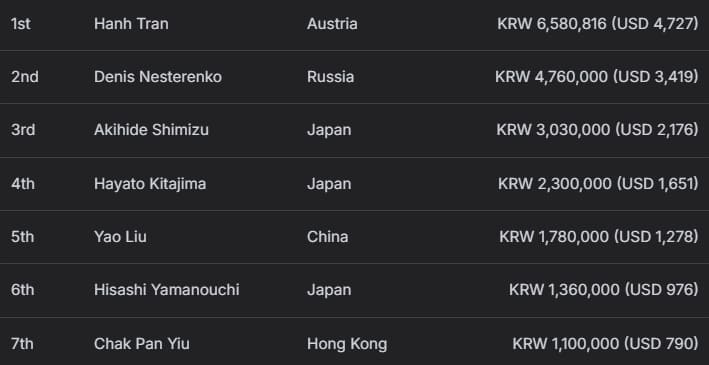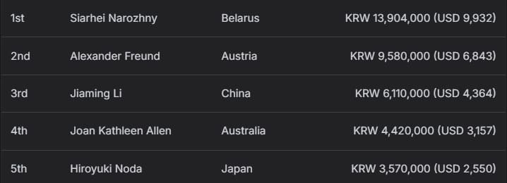 奥地利选手Alexander Freund获得亚军,赢得9,580,000韩币(约合6,843美元)奖励;中国选手Jiaming Li位列季军,收获6,110,000韩币(约合4,364美元)。
