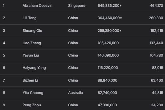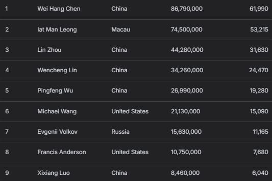 Mingcong Chen状态仍旧火热——这位中国选手刚征服APT超级豪客赛锡狮奖杯,并在小型超级巨星挑战赛中获得亚军,此番以1,203,000记分牌量跻身前三。