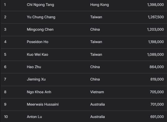 中国香港选手Chi Ngong Tang以1,398,000记分牌量领跑全场。