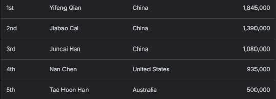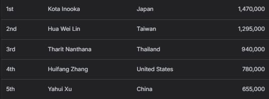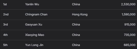 中国选手Difei Wu以14,100,000韩币(约合10,071美元)的季军成绩收官。