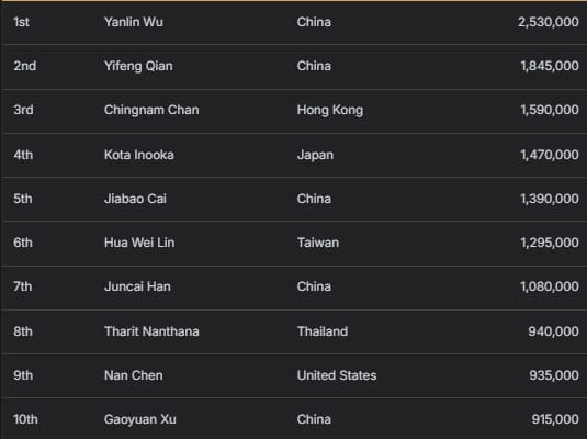 曾在2025 APT台北站主赛事获亚军的Leong,此次以74,500,000韩币(约合53,215美元)的亚军成绩收获生涯第三高奖金。中国选手Lin Zhou则以44,280,000韩币(约合31,630美元)的季军成绩创下个人生涯第三高奖金纪录。