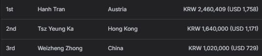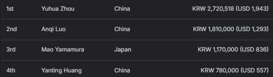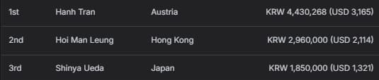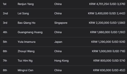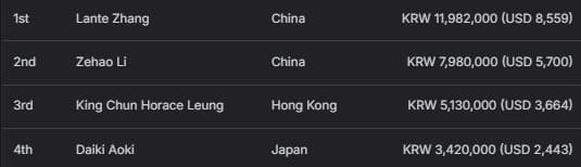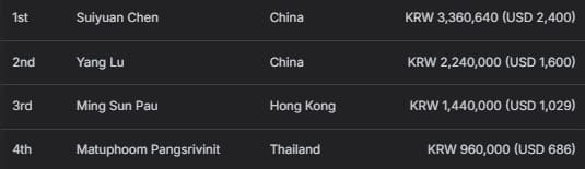 中国香港选手Tsz Yeung Ka获得亚军及1,640,000韩币(约合1,171美元)奖励;中国选手Weizheng Zhong位列季军,收获1,020,000韩币(约合729美元)。