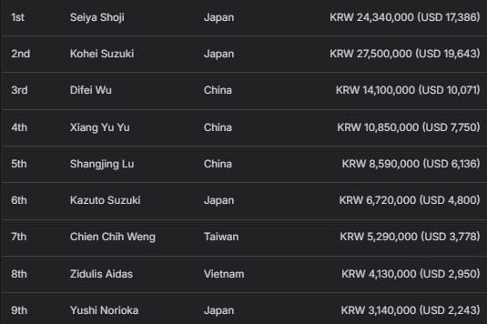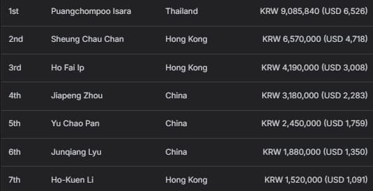 中国香港选手Hoi Man Leung获得亚军及2,960,000韩币(约合2,114美元)奖励;日本选手Shinya Ueda以1,850,000韩币(约合1,321美元)的季军成绩收官。