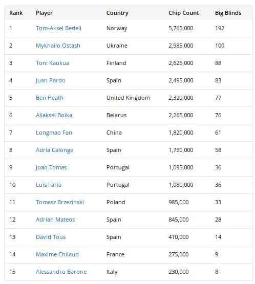 然而,所有人都需仰望Tom-Aksel Bedell。这位挪威商人凭借后期连续淘汰多人,自第三比赛日起便牢牢占据记分牌榜首。他在牌桌上势不可挡,先后将Giorgos Onisiforou、Grzegorz Kozieja和Tom Vogelsang等选手送出局。如今他以5,765,000的记分牌强势领跑,远远甩开紧随其后的Mykhailo Ostash(2,985,000)和Toni Kaukua(2,625,000)。
