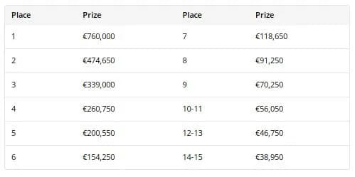 目前留在赛场上的15位选手均已确保至少获得€38,950,但随着他们向决赛桌逼近,奖金的跳跃幅度将非常显著。