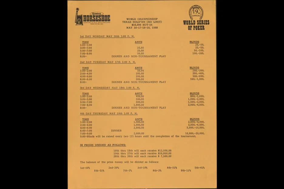 从赛事的一张结构表可以看出那时的节奏大不相同。第一天进行三个两小时的级别以及第四个级别的前半段,随后暂停比赛,供玩家晚餐并参与常规桌游戏。第二天,玩家回来打完第四个级别的后半段,再进行三个两小时的级别。之后再次安排晚餐与常规桌游戏,第三天重复第一天的赛程。第四天在晚餐休息后继续比赛,直至当晚决出冠军。