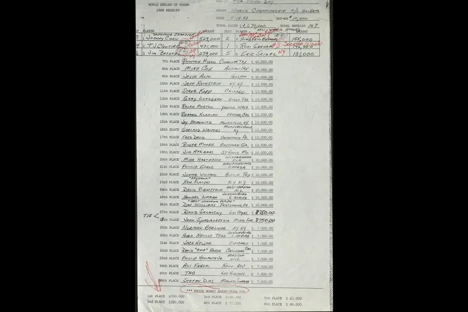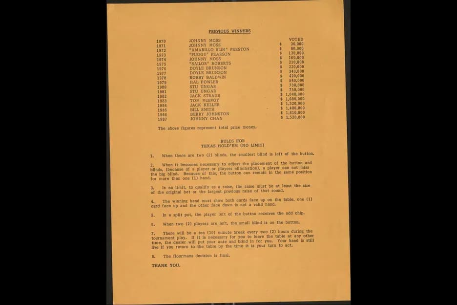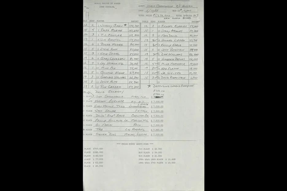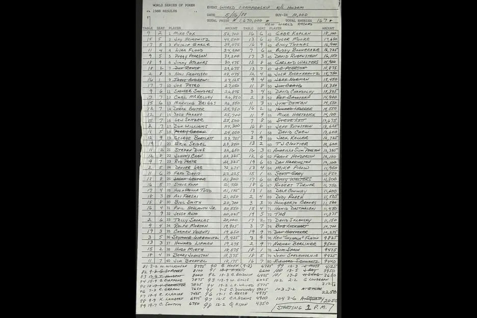 1988年世界扑克系列赛的所有结构表、记分牌统计和媒体笔记,至今仍完好保存在拉斯维加斯内华达大学图书馆的特藏部。深入查阅这些档案,能揭示更多关于这项急速发展的扑克盛事的细节。