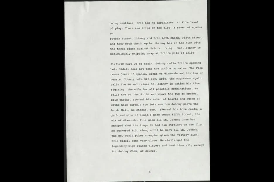 记录纸上还草草写着其他问答。感觉如何?“感觉像个冠军——棒极了。无限注德州扑克是我最拿手的。”背景信息显示他在拉斯维加斯经营餐厅。当时30岁的Chan还告诉采访者,他会咨询占星师。