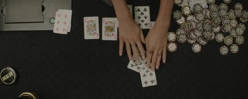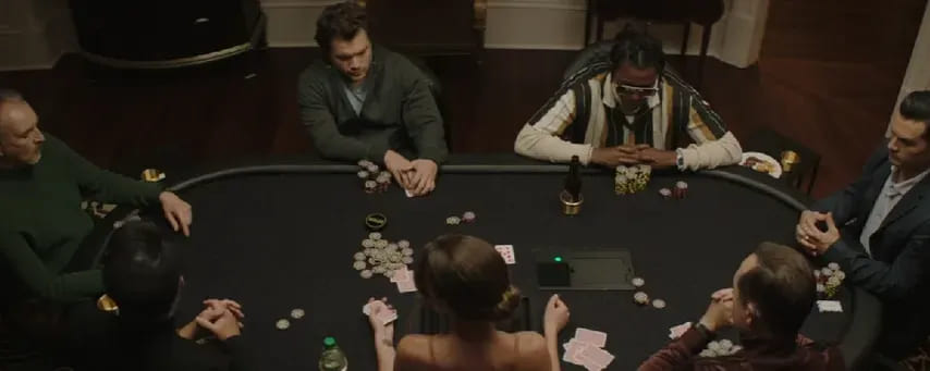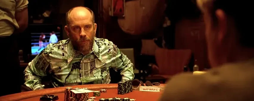 其他因素共同导致了乏味的扑克场景:无趣的镜头角度、拙劣的表演、以及对“反转瞬间”的执着。通常我们只能看到扑克蒙太奇,或主角轻松击败对手的牌局。镜头在面部特写与牌桌间切换,毫无张力。