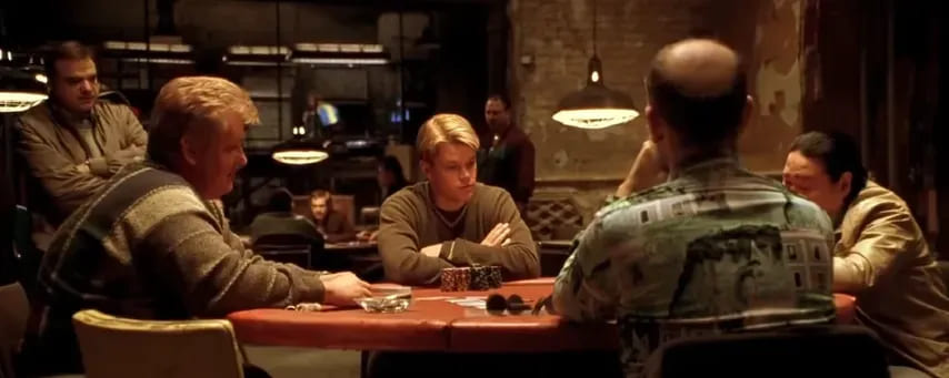 在《赌王之王》中,马特·达蒙在地下牌局输光一切,迫使他走上赎罪之路,最终在牌桌上获胜。故事的激励事件发生在牌桌上,结局也回归牌桌。