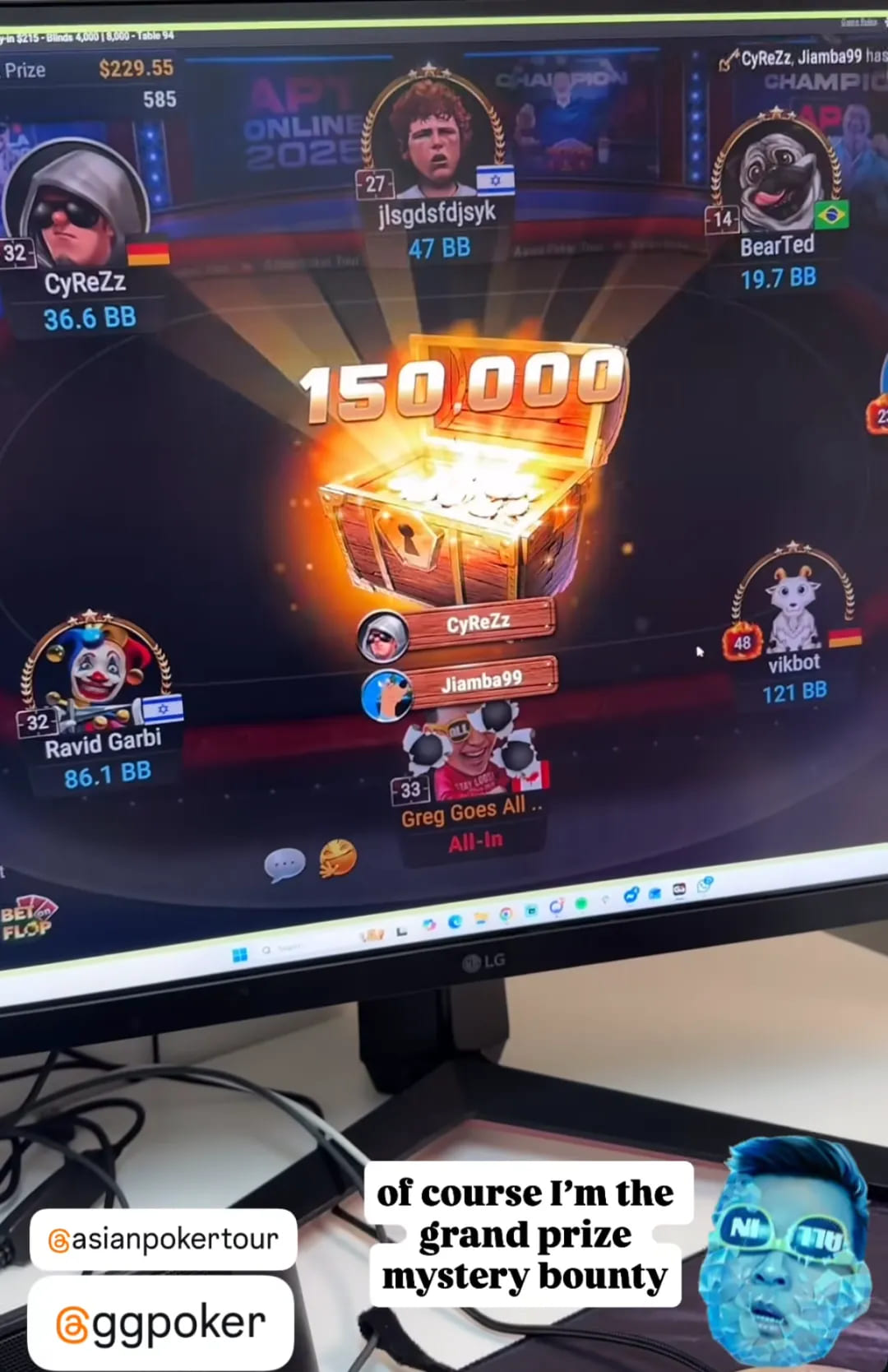 有趣的是,总不缺席APT的GGPoker大使Greg Goes All In,在这场比赛还成为了“15万刀最高赏金的苦主”。