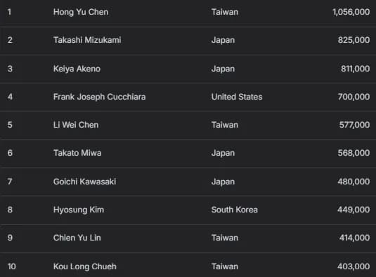 爱沙尼亚选手Ranno Sootla在漫长的单挑拉锯战中,展现其顽强斗志,最终以811,000新台币(约2.63万美元)的亚军成绩收官。泰国选手Anusorn Asiralertsiri以531,000新台币(约1.72万美元)季军奖金跻身第三。