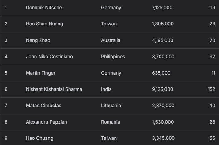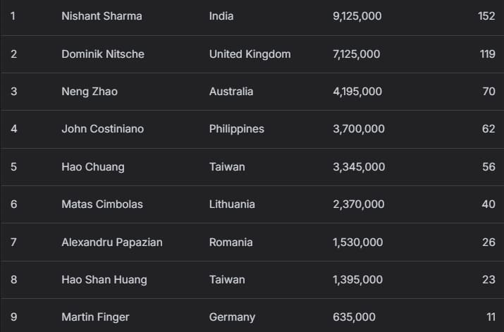 6号位:Nishant Sharma(印度)– 9,125,000(152 BB)
