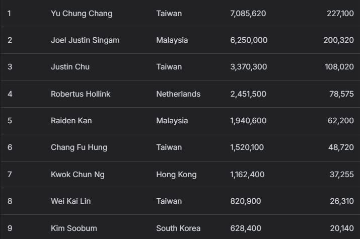 9号位:Hao Chuang(中国台湾省)– 3,345,000(56 BB)