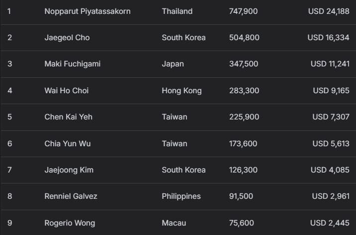 多位前APT冠军同样在圈:APT 岘港夏季系列赛主赛事冠军Shixiang Khoo(第36名,165,100新台币)、APT 岘港夏季系列赛超级豪客赛冠军Julian Warhurst(第56名,110,500新台币)、APT 仁川站主赛事冠军Junjie He(第64名,110,500新台币)、前主赛事冠军Dicky Tsang(第156名,62,900新台币),以及2025 APT 台北站主赛事冠军Akira Takasugi(第224名,54,500新台币)。