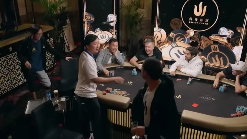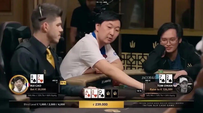 这手牌发生在马德里的Triton系列赛,盲注为1,000/2,000,并有强制性的4,000straddle(曹睿)。