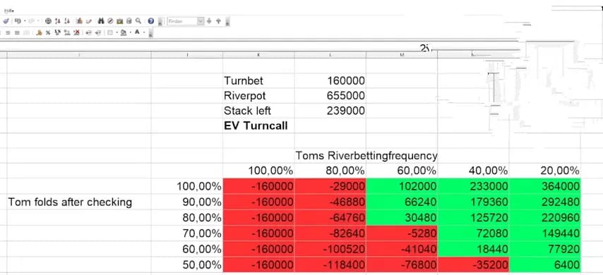 如果Dwan在任何河牌都全下,曹睿必须弃牌,损失160,000。Dwan全下河牌的频率越低,他的对手就有越多机会自己全下,而手牌的期望值将取决于Dwan在过牌后跟注和弃牌的频率。
