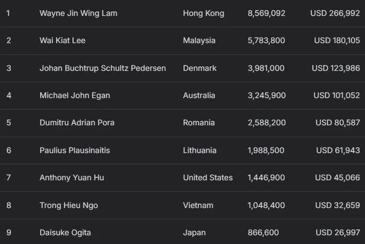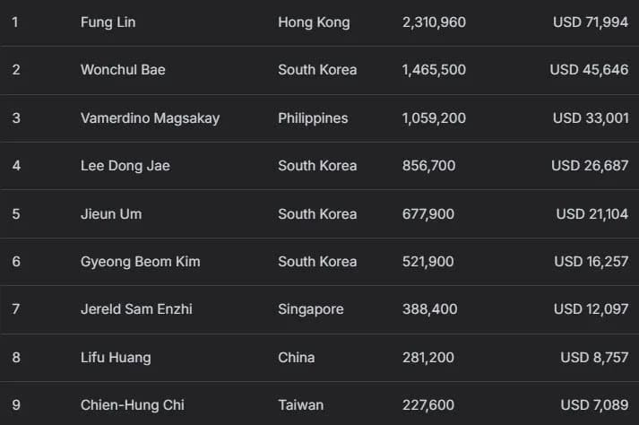 中国香港选手Wayne Jin Wing Lam以稳健的表现成功登顶,捧起个人首座 APT 雄狮奖杯。他曾在2025 APT 台北站主赛事中获得季军,与狮王奖杯失之交臂。这次他圆满收官,用8,569,092新台币(约266,992美元)、扫除阴霾自我正名,也创下其生涯最高奖金纪录。