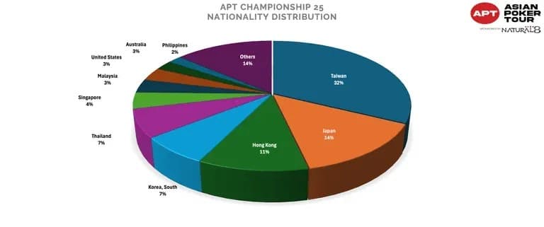 25,000新台币(约810美元)的[赛事3] 极限深筹冠军赛以1,867人次,位列本届大赛规模第二。虽没在参赛人数或奖池方面刷新纪录,但该项赛事以汇聚全球49个国家选手,创下APT史上最多元化选手参赛纪录。